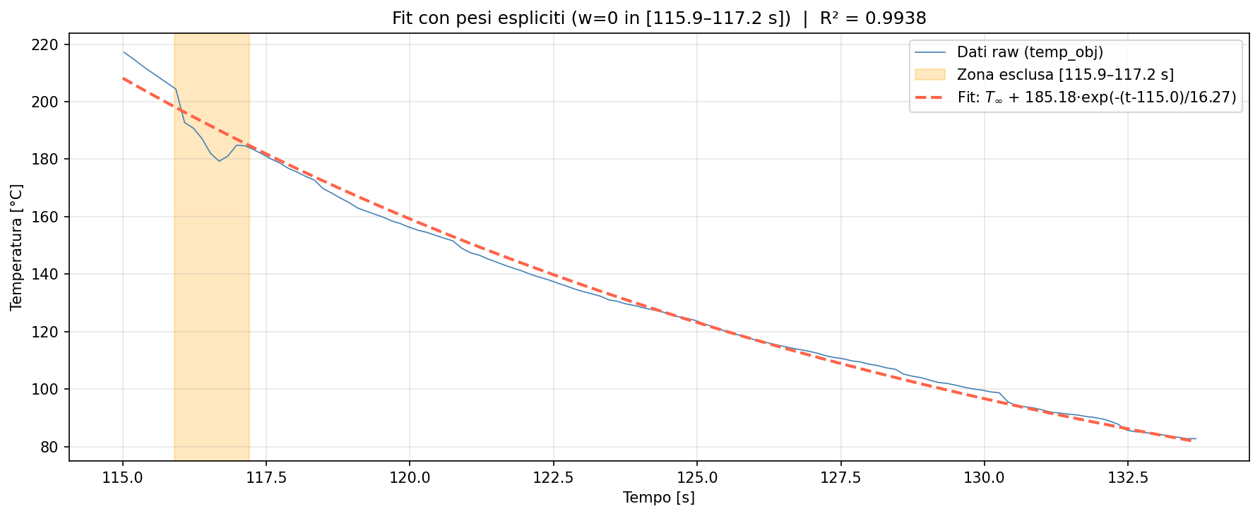 - fit_raffreddamento_intero.py: fit TRF su finestra completa [115s–fine] con pesi nulli sulla zona di transizione [115.9–117.2s]